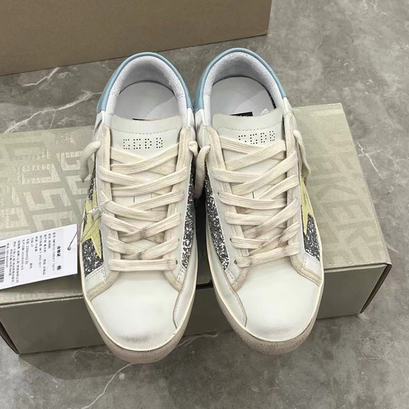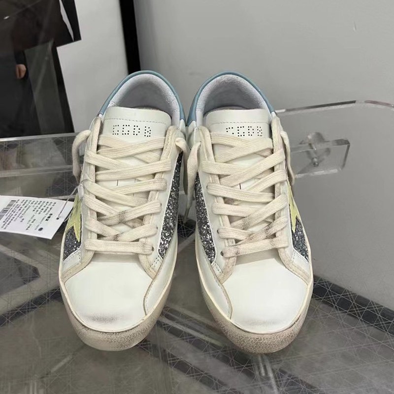 Super-Star with golden glitter star and blue matte cowhide leather heel