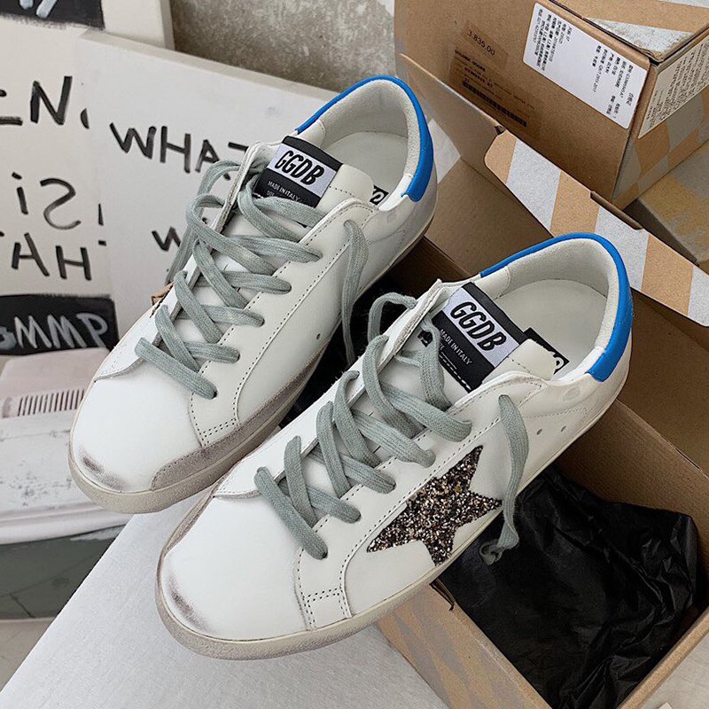 Super-Star with golden glitter star and blue matte cowhide leather heel